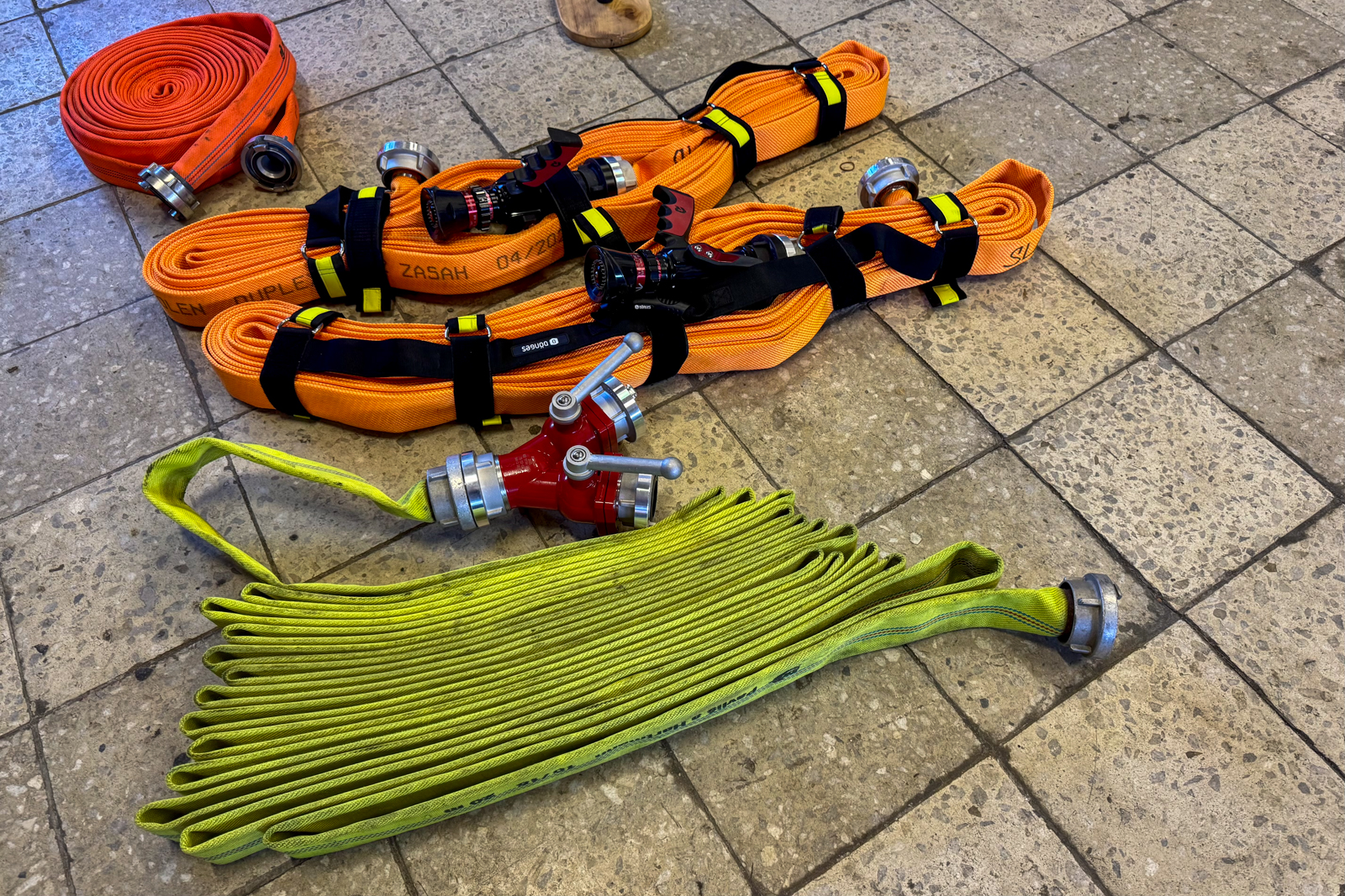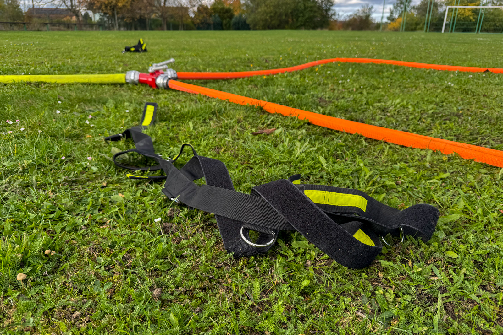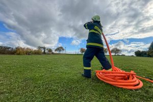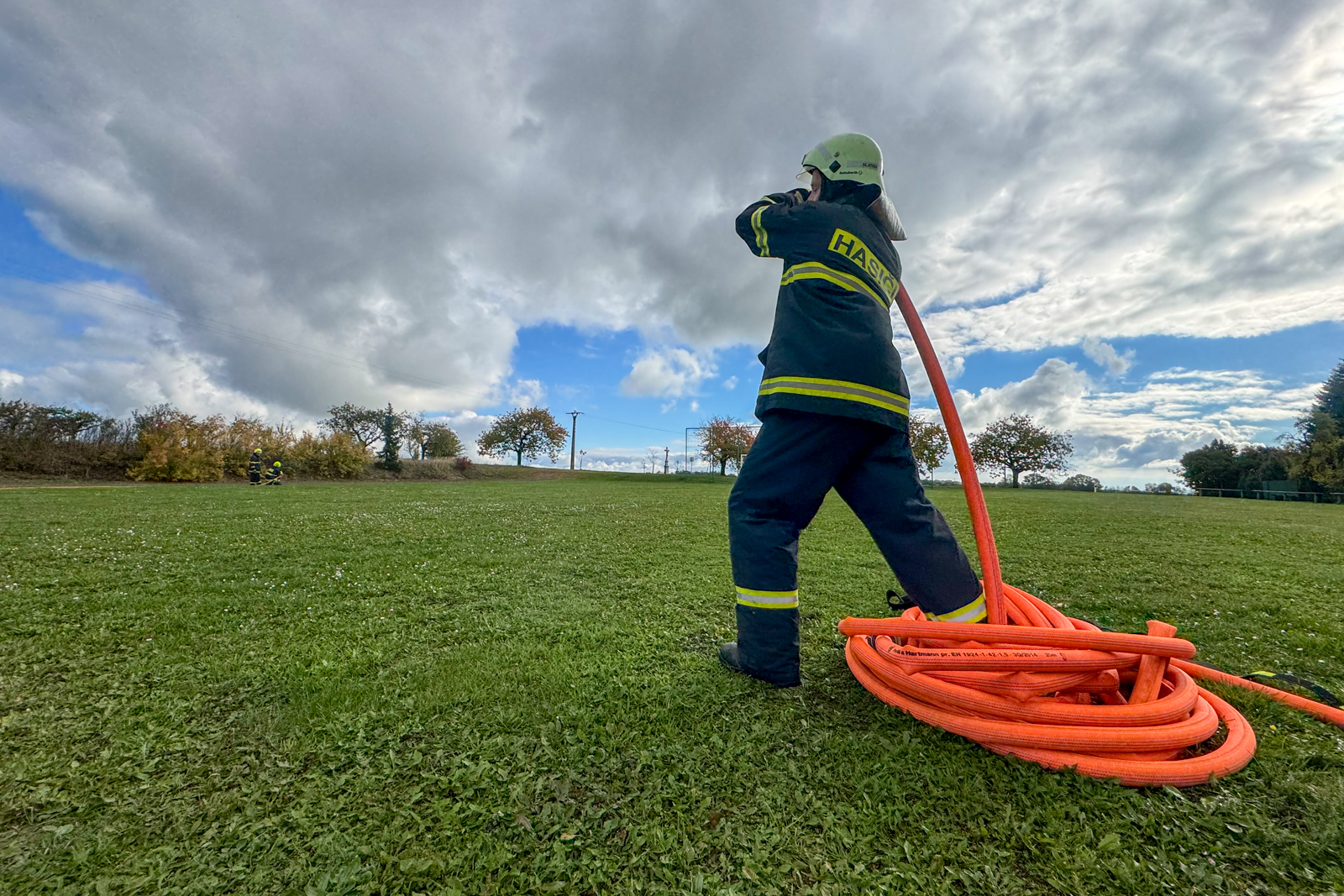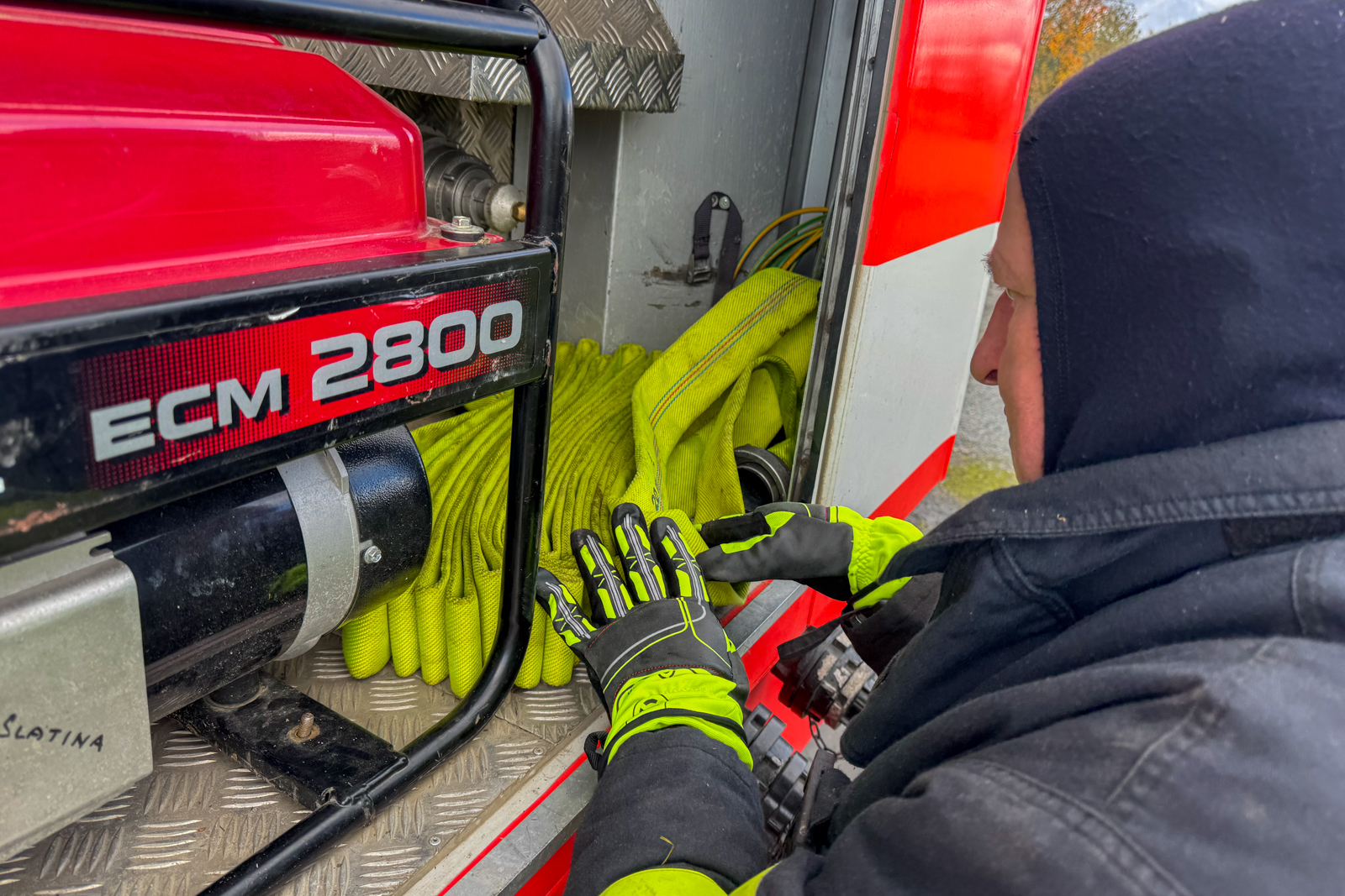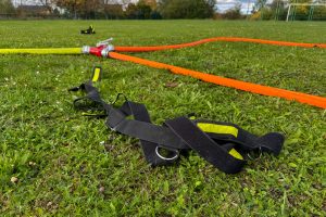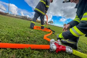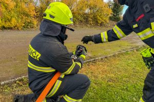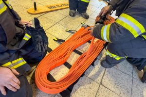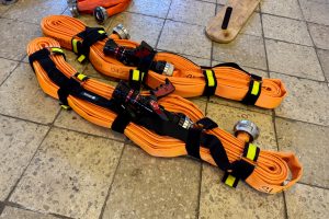 Třicetimetrové hadice C42 vozíme v jednotce uloženy v textilních nosičích. Hasiči se nejprve metodicky seznámili s motáním hadice do „Clevelandu“, používání nosičů, zkoušeli si obsluhu v rukavicích i bez.