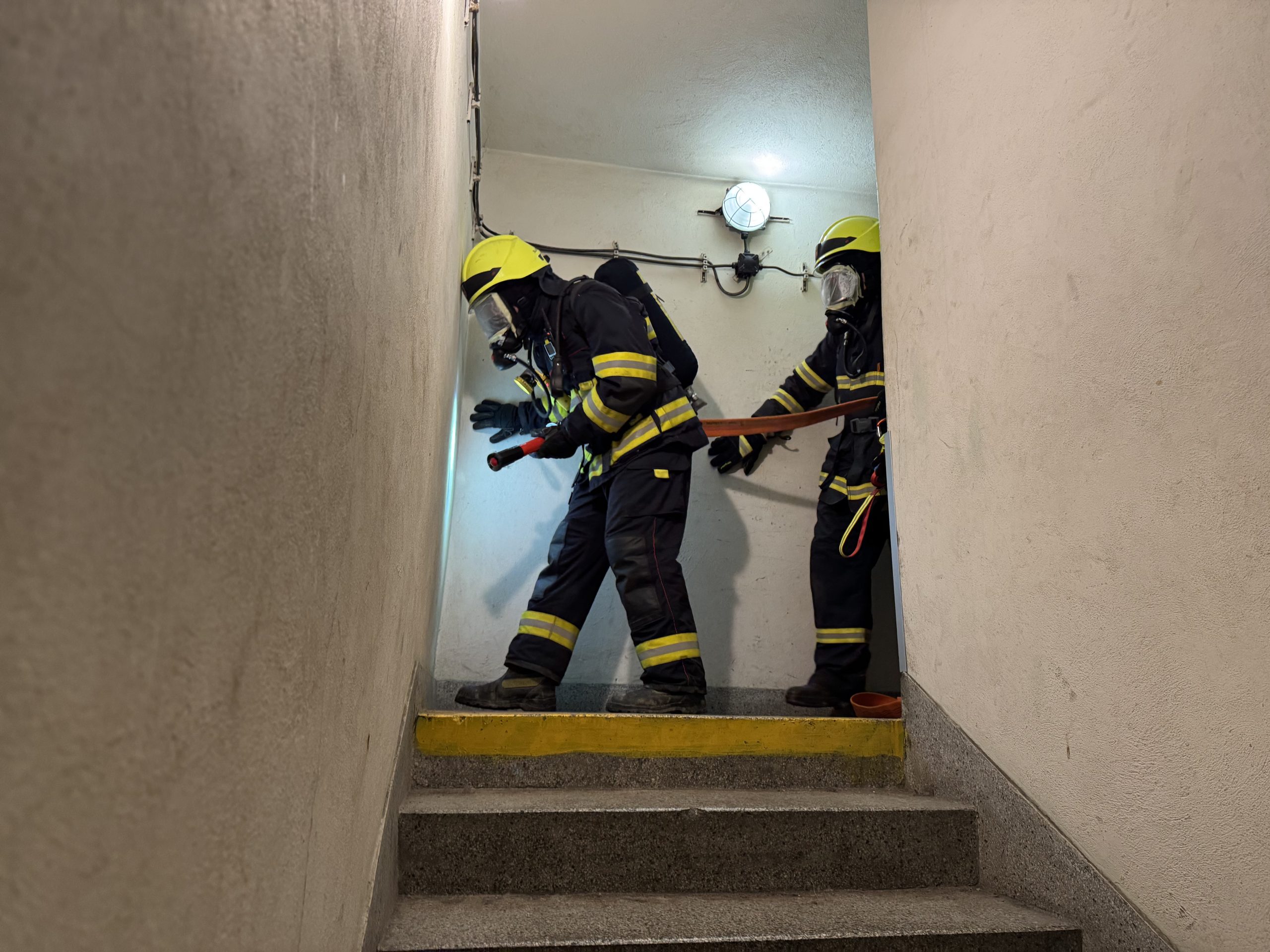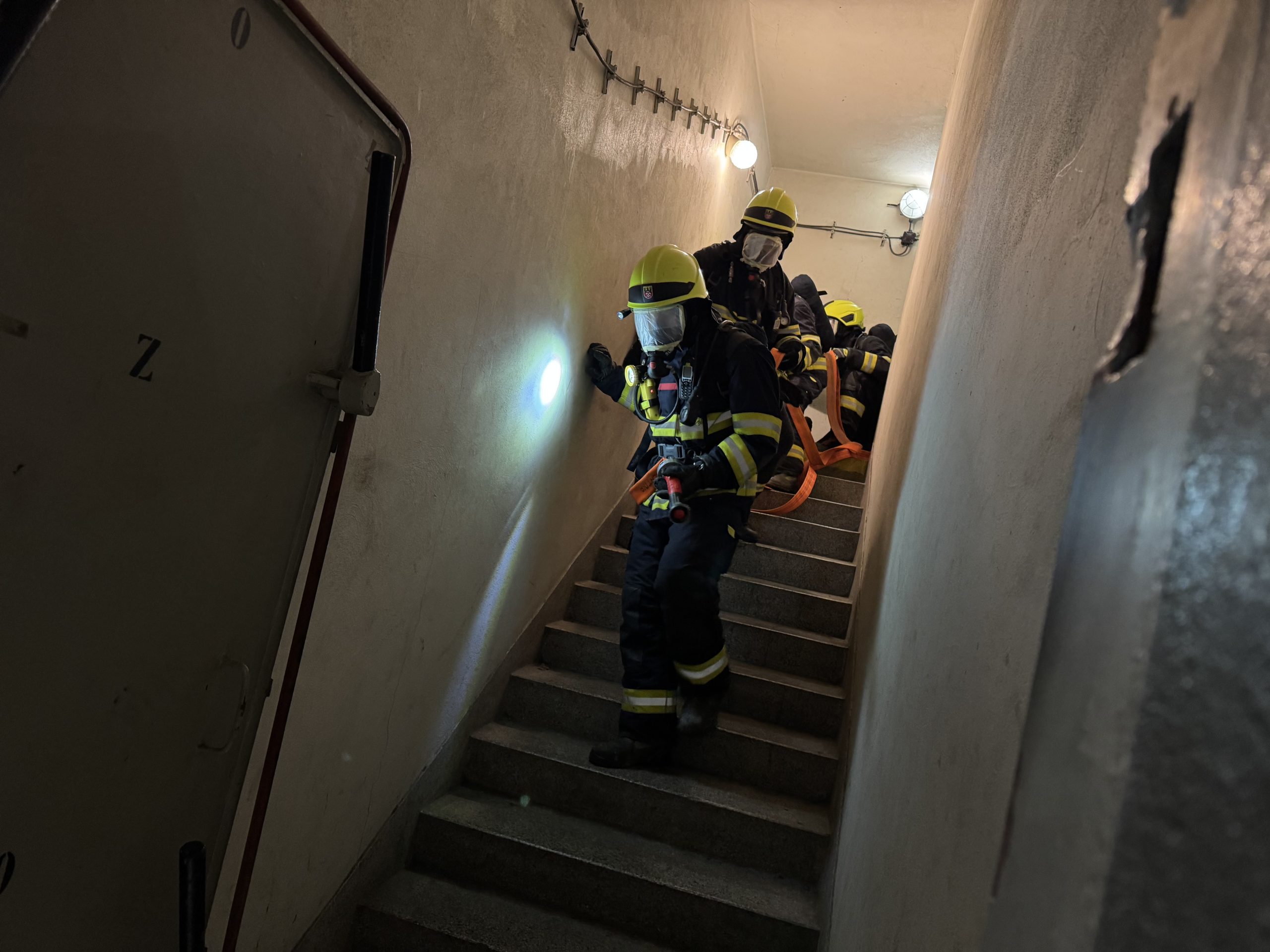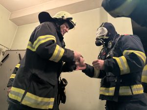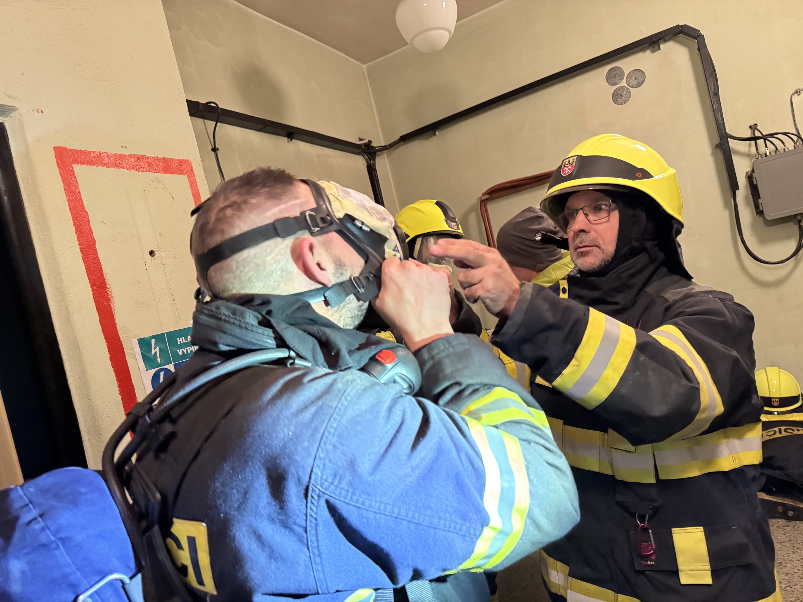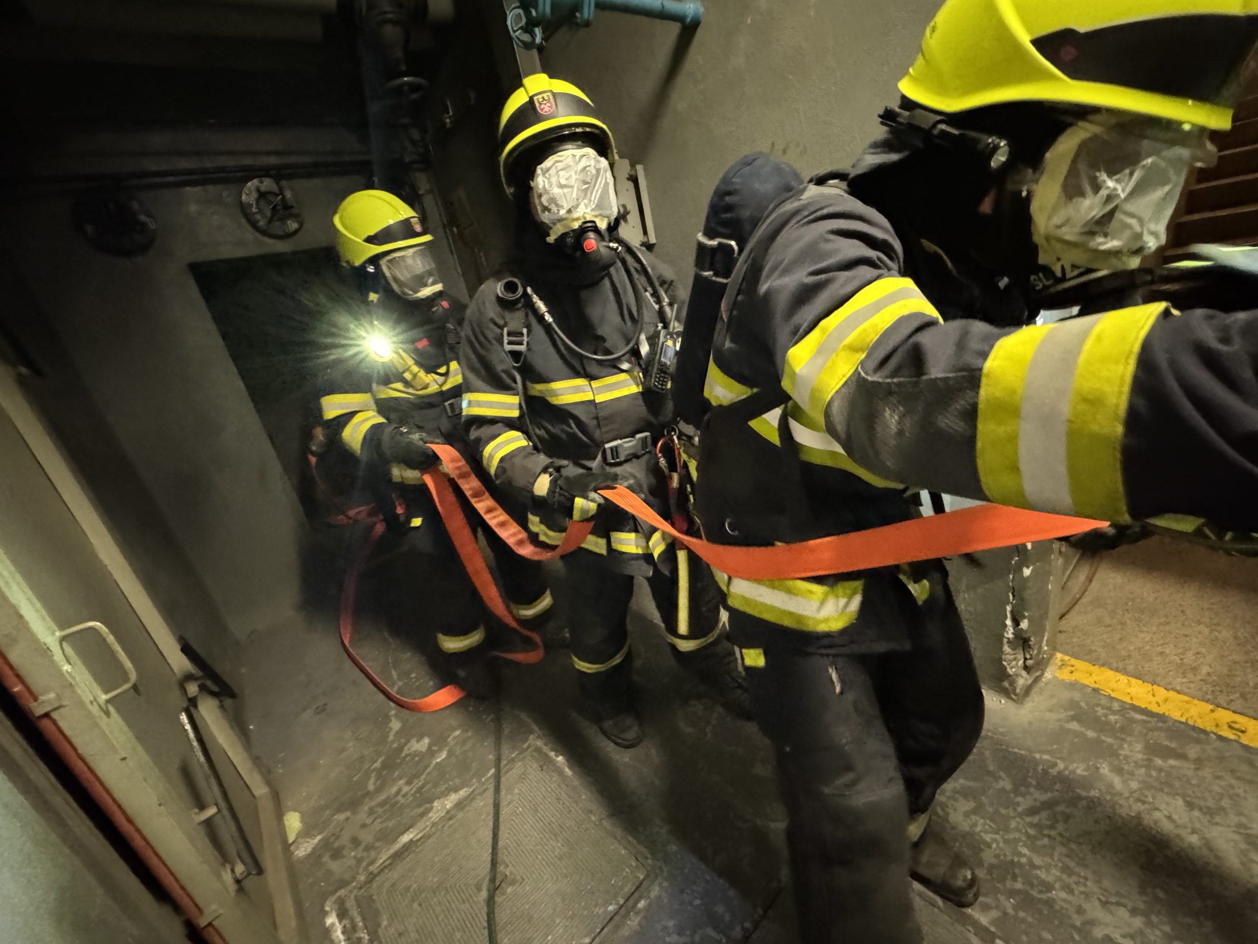 Tématem byl pohyb v neznámém zakouřeném prostředí, které bylo simulováno přelepením zorníků masek dýchacího přístroj. Vyzkoušeli jsme si rovněž komunikaci radiostanicemi a orientaci podle hadice.