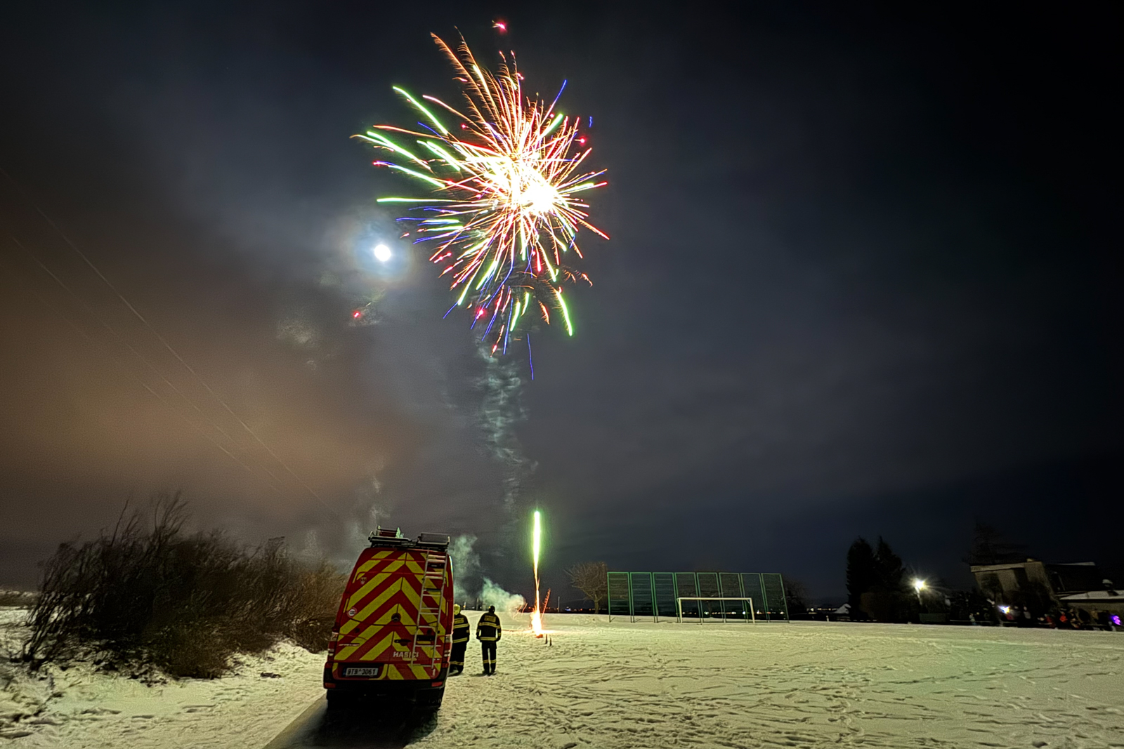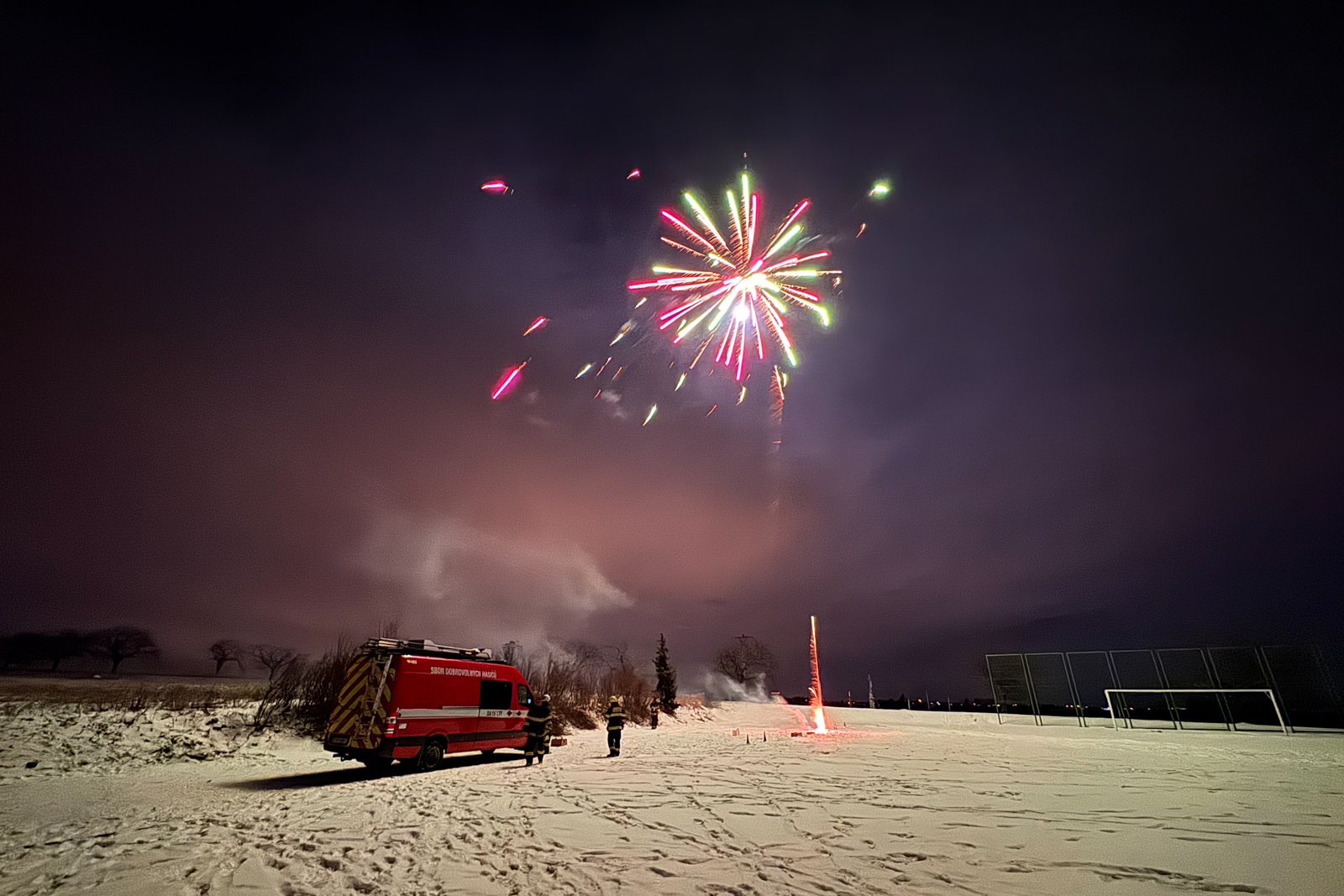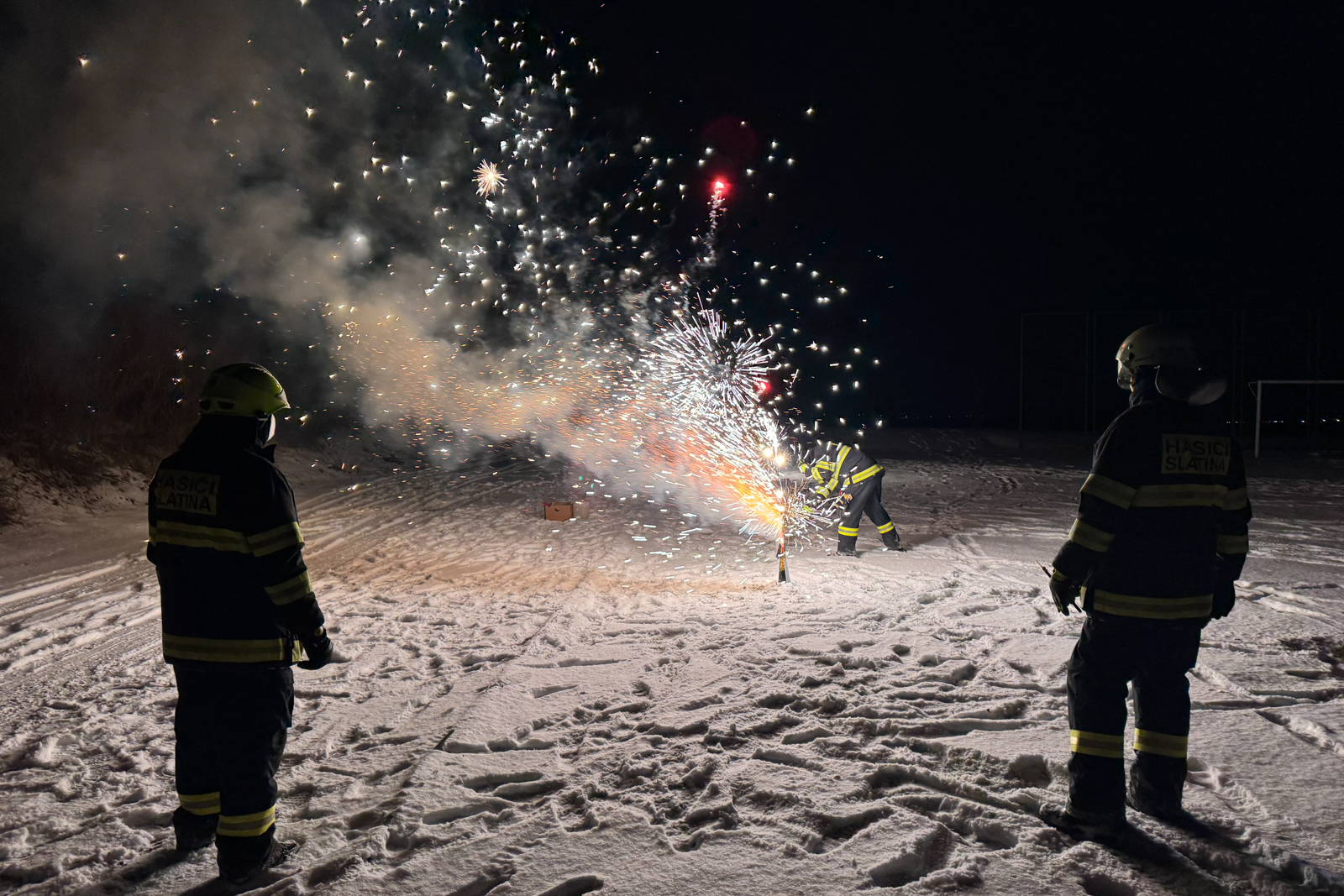 Zatímco část obecních zastupitelů zajistila na místním fotbalovém hřišti teplé občerstvení pro občany, kteří se přišli podívat, hasiči dozorovali samotný ohňostroj.