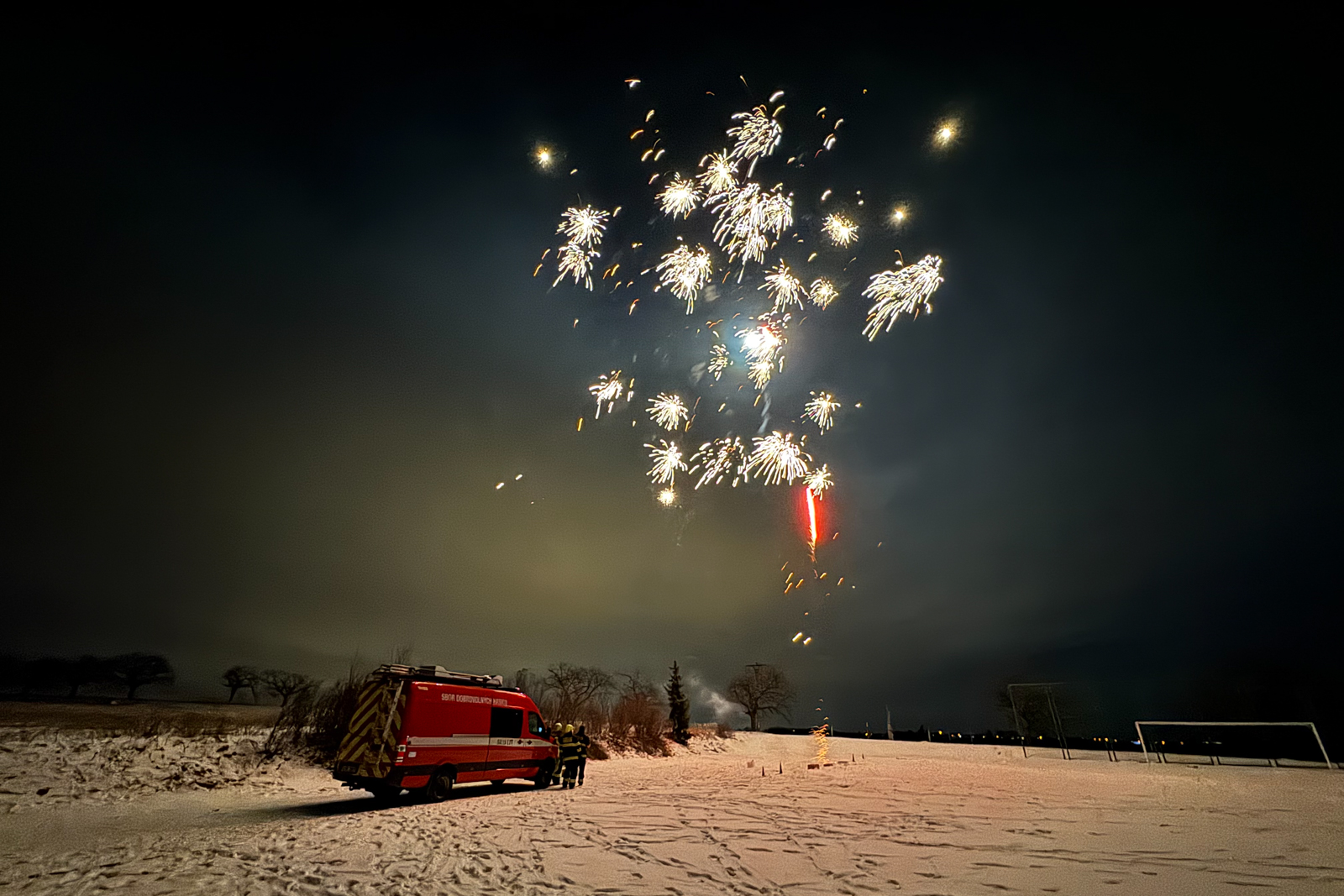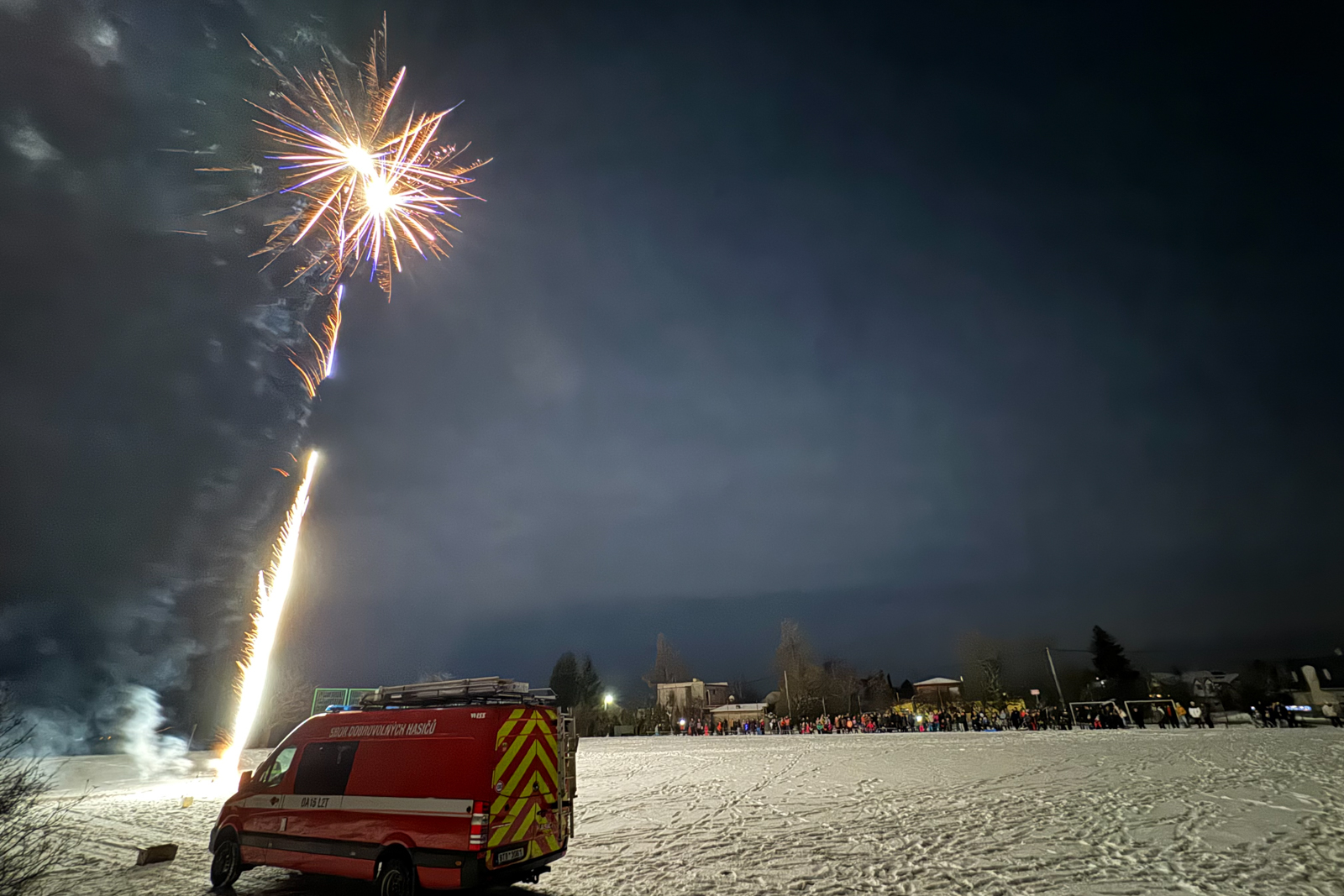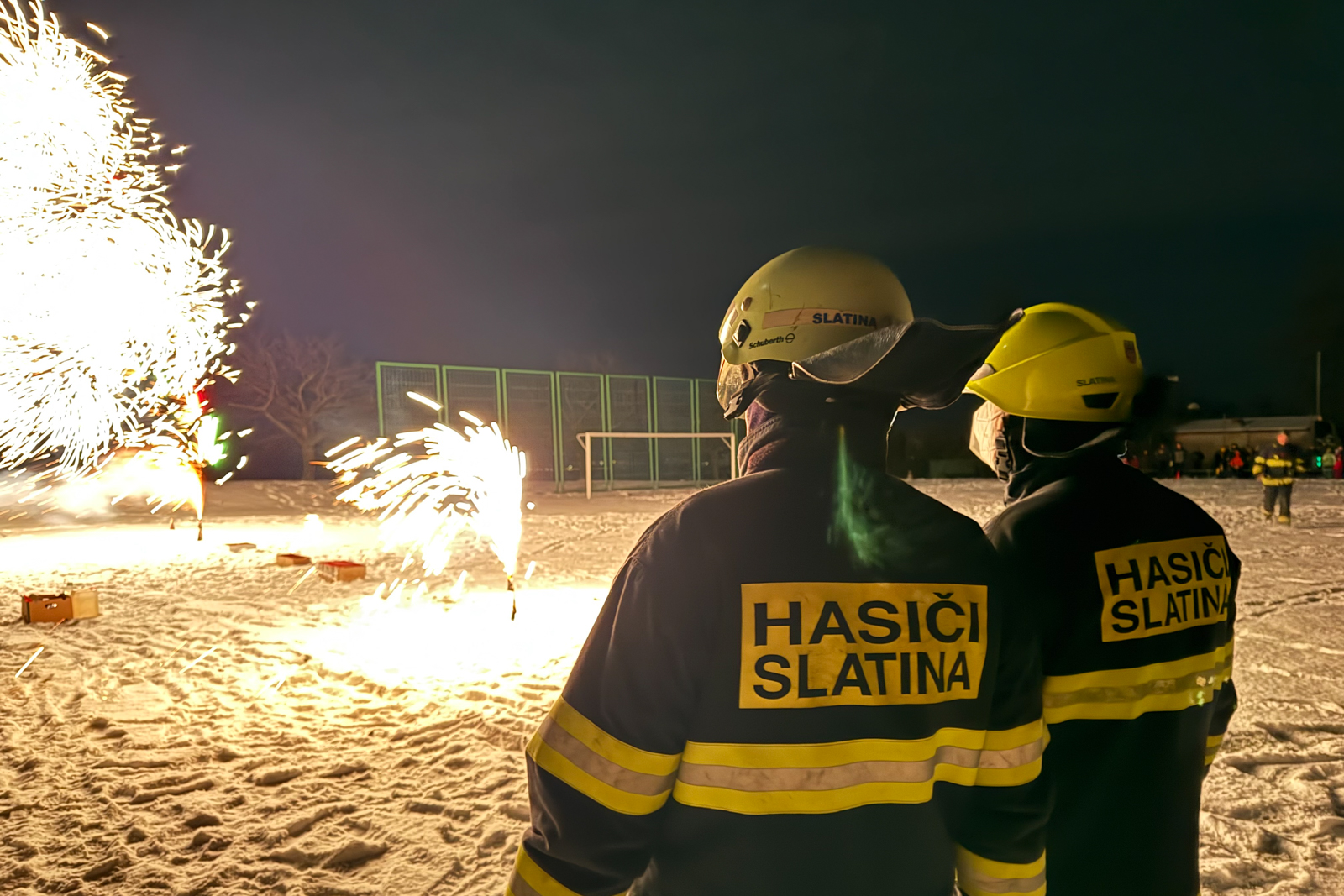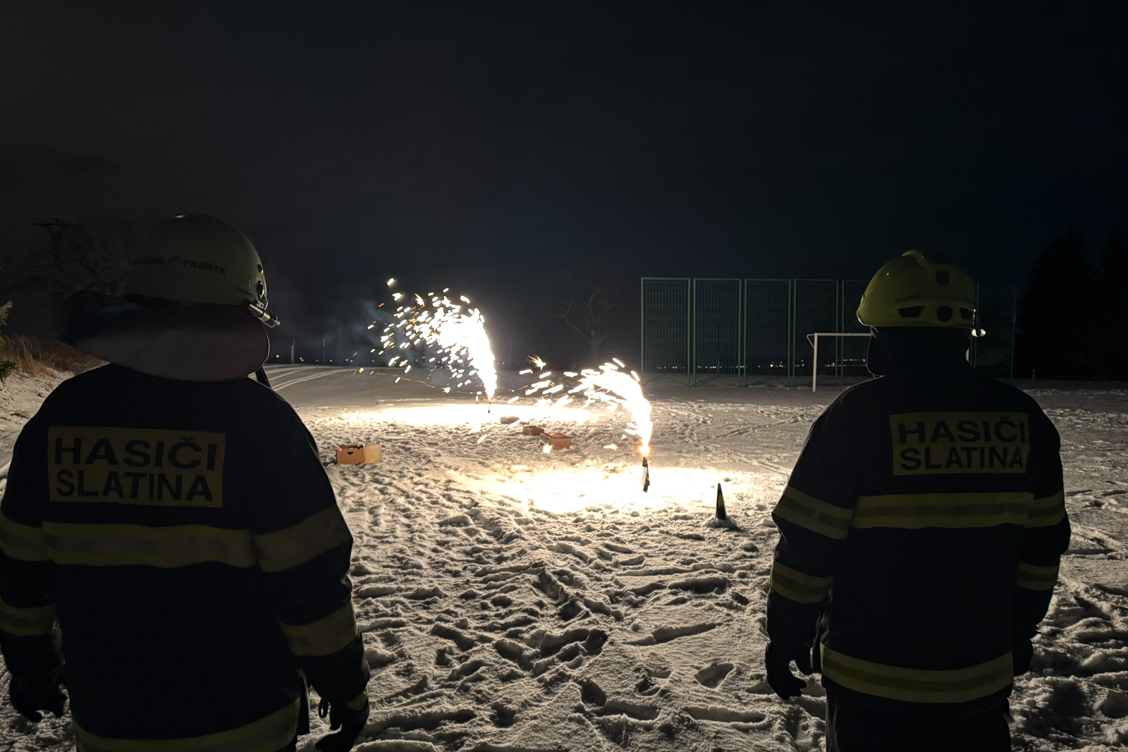 Zatímco část obecních zastupitelů zajistila na místním fotbalovém hřišti teplé občerstvení pro občany, kteří se přišli podívat, hasiči dozorovali samotný ohňostroj.